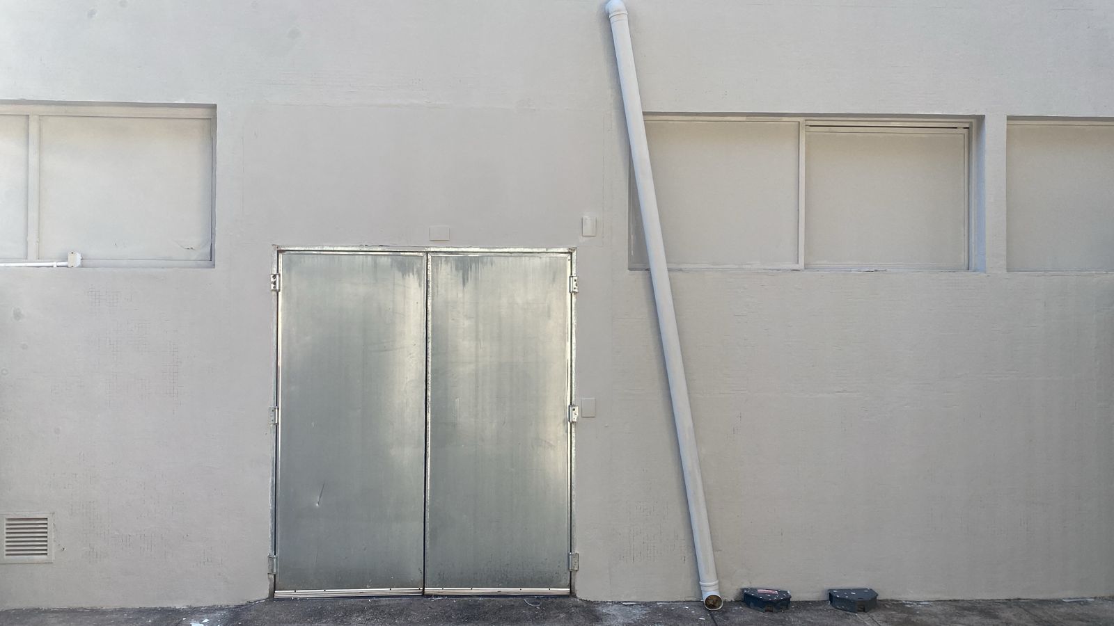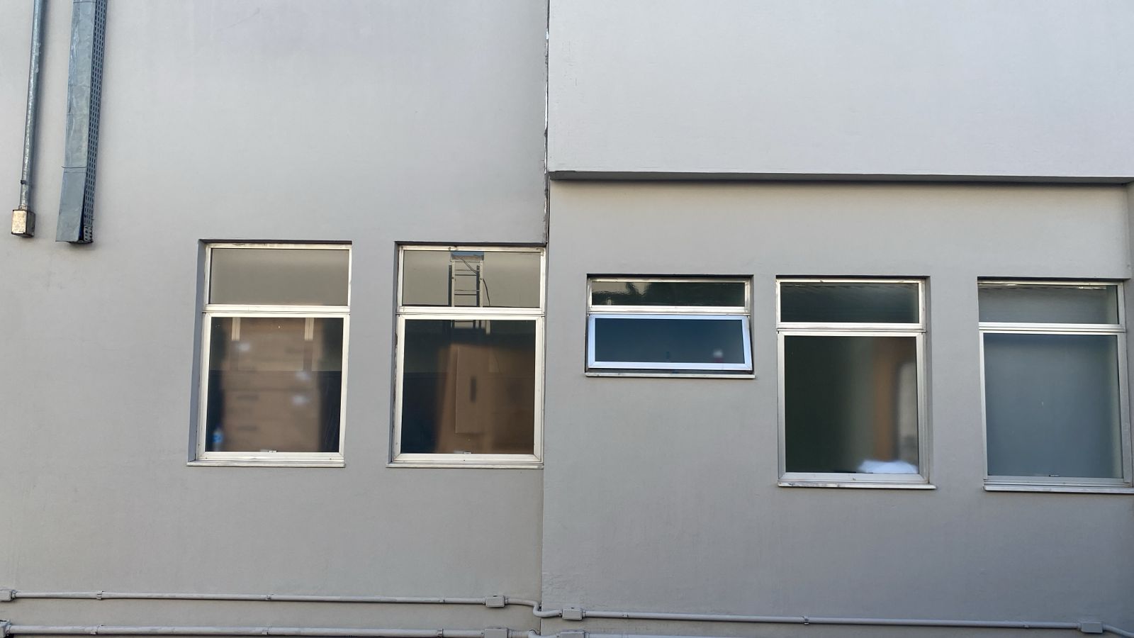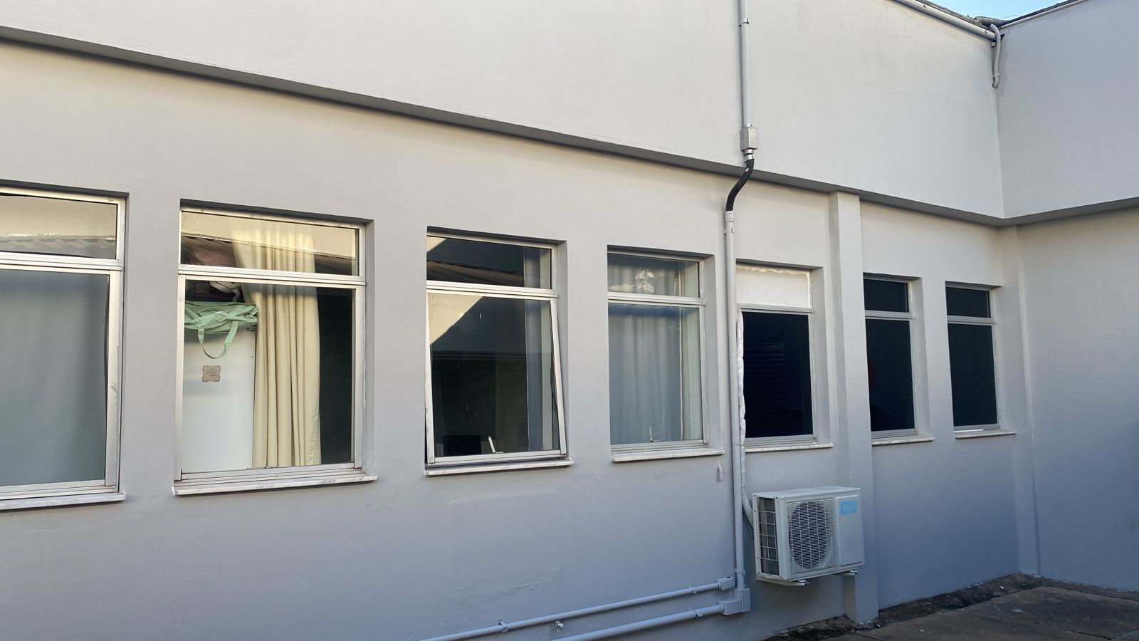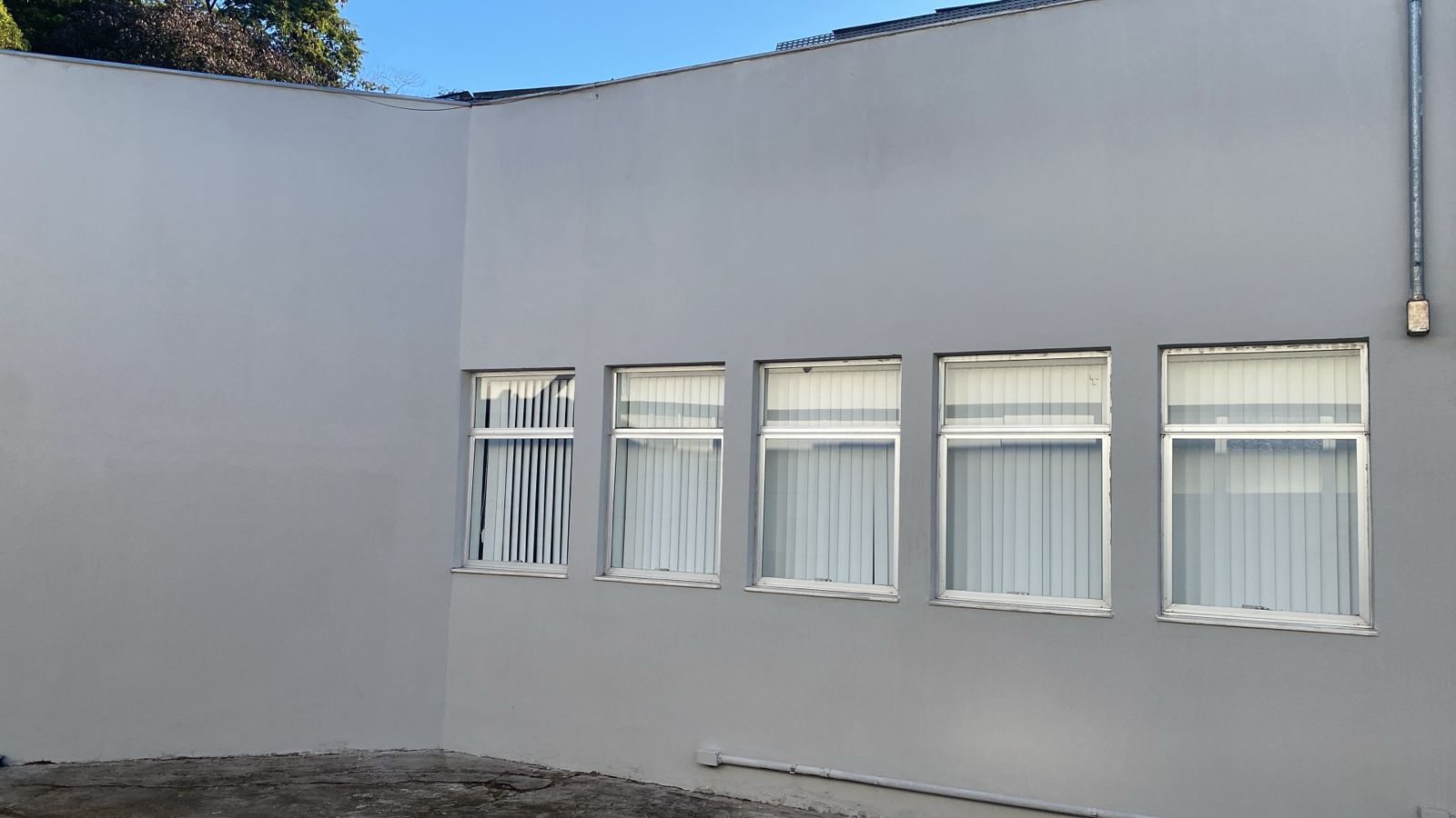 Revitalização do ambiente através de recuperação de imperfeições na alvenaria com argamassa, impermeabilização da parede, acabamento da superfície com massa corrida e finalização com tinta acrílica lavável para área externa.